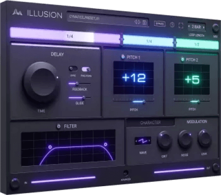 ILLUSION: Creative Delay PluginA Versatile Delay Effect With Limitless OutcomesReshape Any Audio Signal with Unique Echo & Pitch ModulationILLUSION is a unique delay plugin that was heavily inspired by vintage hardware delay pedals.To be more specific, this plugin is a detailed emulation of a bucket brigade delay (BBD).The delay / pitch shifting capabilities of ILLUSION can transform any sound thousands of different ways.Whether youre using it on a melody, one shot, vocal, percussion, drums, etc...We designed this plugin to instantly transform any audio signal you throw at it.Make sure you listen to the “before and after” demos below to get a better understanding of what it can do.What makes Illusion special?This plugin harnesses the magic of analog gear, infusing your sound with the richness and warmth that genuine BBD (Bucket Brigade Device) technology is admired for.ILLUSION pushes the boundaries, stacking not one, not two, but FOUR of these iconic BBD chips, allowing you to re-imagine the sonic DNA of any sound with pinpoint accuracy.And then, theres the unpredictable pitch-shifting sequencer