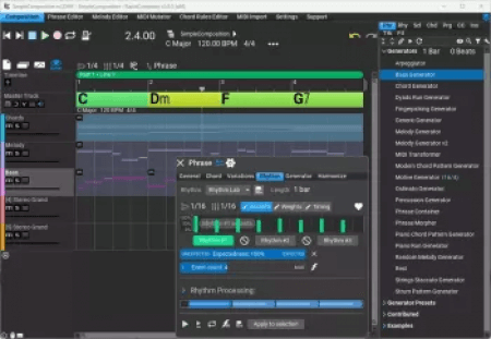 Included phrase generators: Arpeggiator, Bass Generator, Chord Generator, Dyads Run, Generator, Fingerpicking Generator, Generic Generator, Phrase Container, Piano Run Generator, Strings Staccato Generator, Piano Chord Pattern Generator, Strum Pattern Generator, only in the full edition: Melody Generator, Motive Generator, Random Melody Generator, Phrase Morpher