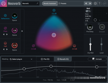 Having a clean input signal is the key to getting a great reverb tone, and iZotope Neoverbs 3-band Pre EQ gets you set up by listening to your audio and suggesting the best areas to cut